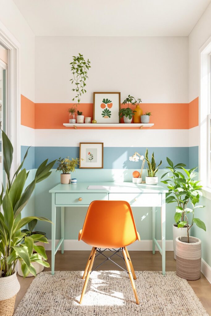 For example, a deep blue rectangle on a white wall can signal a workspace. Color zoning paint ideas like this enhance function while keeping the style consistent. That’s how I zone bedrooms too—subtle sections separating sleeping areas from wardrobe or desk space (source).